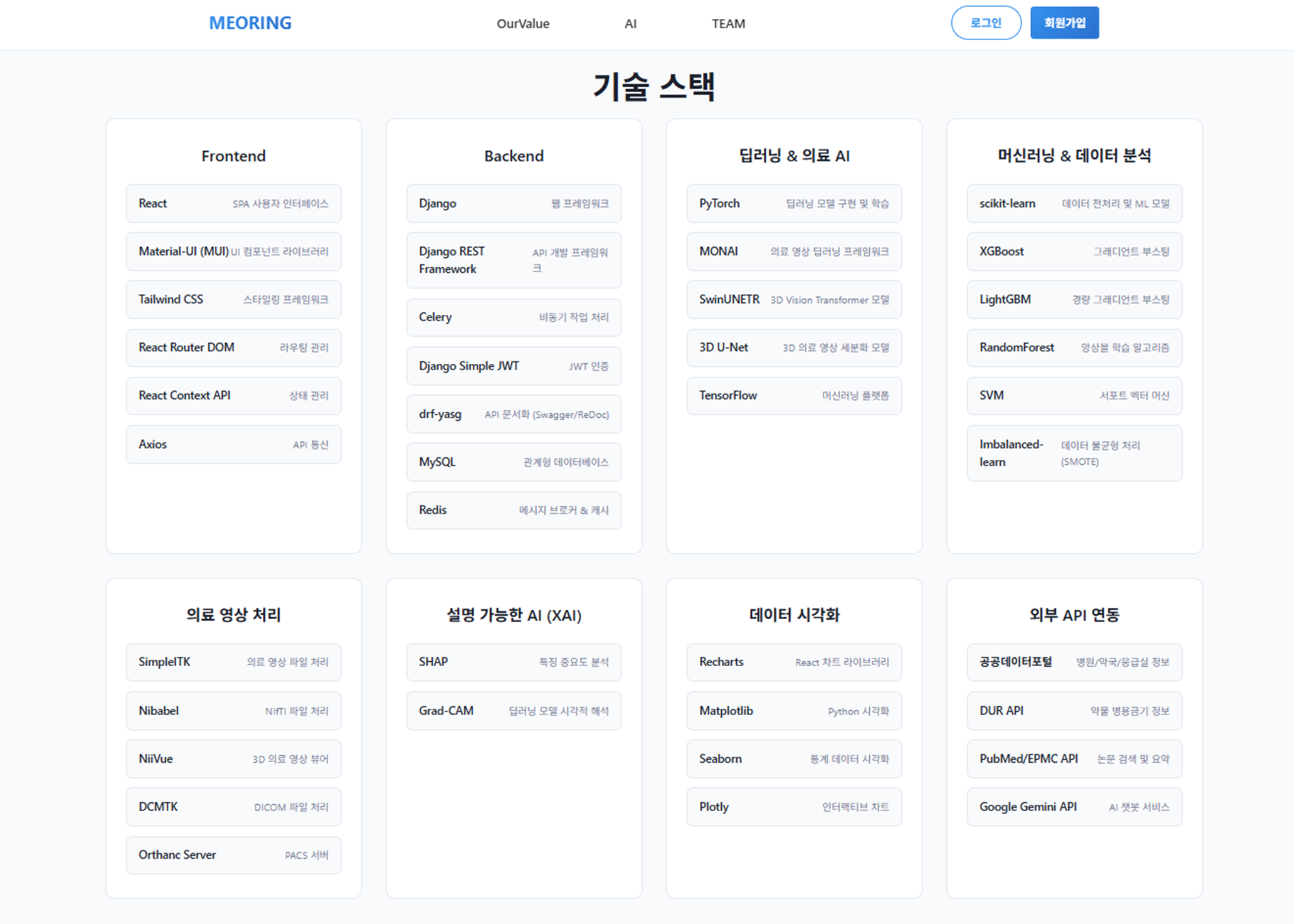 Python, Pandas, Scikit-learn, Pytorch, SHAP, Matplotlib, Django, React, Flutter, PACS/EMR 연동, LLM 기반 생성형 AI 챗봇